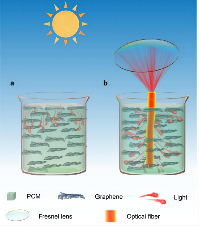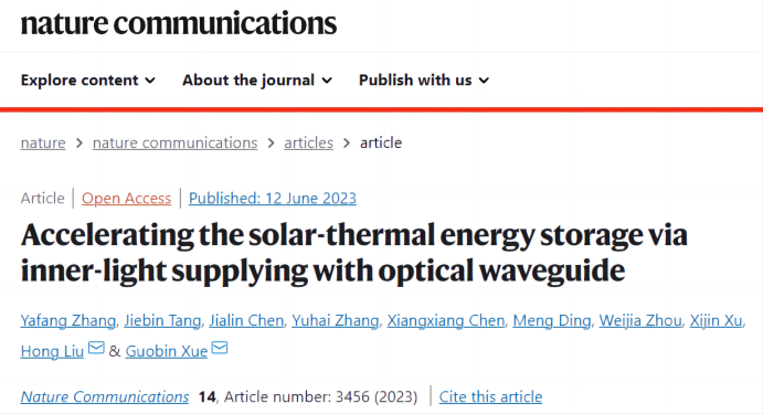 的薛国斌教授、刘宏教授团队提出了一种内通光模式增强太阳能相变速率的策略,通过侧发光光波导纤维将太阳光传输到石蜡-石墨烯复合材料中,在空间维度上调节太阳热转换界面。这种内部供光模式避免了蓄热材料(PCM)表面过热,充能速率比表面照射模式提高了123%,太阳能热效率提高到94.85%。此外,采用内通光供能方式的器件在大型室外也能有效工作,表明了该热固定定策略在实际应用中的潜力。。该研究成功以“Accelerating the solar-thermal energy storage via inner-light supplying with optical waveguide”为题,发表于Nature communications,第一作者为成人AI