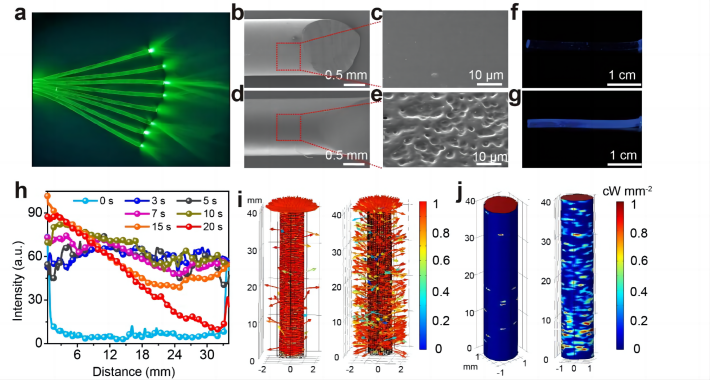 本文所用的商业PMMA基光波导纤维如图2a所示,光主要由光导纤维端面发出,这种光导纤维在日常生活中经常被用来作为灯光装饰品。经过化学刻蚀(丙酮正己烷溶液),光滑的波导纤维表面形成粗糙结构(图2b-e),这种粗糙结构可以赋予光导纤维侧方光性能(图2f-g)。不同刻蚀时间下光导纤维侧发光性质如图2h。利用COMSOL模拟不同粗糙结构下侧面发光性能,可以看到孔径大小会直接影响侧发光性能(图2i,j)。通过实验结果结合模拟分析,可选定最均匀的侧面发光纤维。