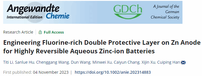 近日,徐锡金教授团队在水系储能领域取得重要研究进展,相关成果以题为《Engineering Fluorine-rich Double Protective Layer on Zn Anode for Highly Reversible Aqueous Zinc-ion Batteries》发表在顶级期刊Angewandte Chemie International Edition上。成人AI