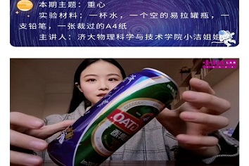 的志愿者们提前录好实验课堂的视频,写好实验课堂的文稿,将内容发送给山东省少儿图书馆的老师,并在山东省少儿图书馆的微信公众号上推出,让孩子们在趣味探究的同时能够学到一些物理小知识。在这次的实验活动中,志愿者们以循序渐进的方式带领着小朋友们探索何为“重心”。志愿者们以生活中的现象为例子,引出“重心”,以科学的角度去讲解“重心”是什么,以带领着小朋友们进行科学小实验的方式加深小朋友们对“重心”的理解与感悟,为小朋友们在生活中遇到的重心现象进行了形象地阐述。