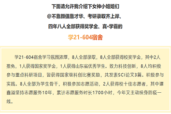 能源专业,一同住在学21-604宿舍,宿舍8人,2人推免,谭鑫溢推免至大连理工大学,张冬梅推免至华北电力大学,4人考取985,211院校,她们用坚持和奋斗收获了各自在四年的本科学习生涯中一份满意的答卷。获奖证书一张接一张,奖学金一项又一项,四年里,这个“学霸宿舍”4人曾担任院级学生会部长及以上职务,8人均担任学生干部。1人获得国家奖学金,山东省优秀学生,2人获得校级十佳志愿者。“学霸”们不仅爱学习,还会专注科研,她们还在全国大学生可再生能源科技竞赛、成人AI
