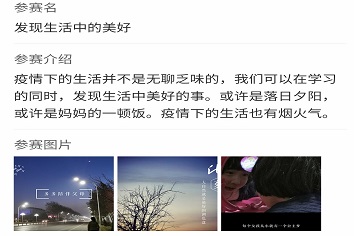 本次活动自4月25号起向物院同学征集作品。作品的格式不限,短视频、文章、照片……只要是身边发生的趣事或是所见所感都可以用自己喜欢的形式记录下来并上传到发布的连接上,截止到4月30号共征集了一百多份作品。每一份作品都记录着生活的美好、体现着平凡中的感动、展示出疫情之下物院学子丰富多彩的生活。活动下一阶段,将征集到的作品面向广大同学发布投票链接,同学们可以根据自己的感受喜好进行线上投票选出此次活动的获奖选手。本次活动共选出了一名一等奖、两名二等奖和四名三等奖,获奖选手将收到精心准备的奖品予以肯定。