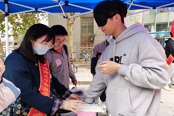 全体同学,让同学们在八食广场前,通过简单的小游戏体验盲人生活的艰辛。活动初期,活动负责人通过多种方式宣传,招募工作人员协助现场组织工作。活动于15号上午准时开始,工作人员提前到达指定地点并进行现场布置,并热情耐心地为同学们介绍活动的内容和形式,并积极邀请过往同学一起参加活动。本次活动共包含两个小游戏,小游戏一需要参与者站在跑道的起始位置,带好眼罩,蒙住眼睛,在同伴的指引下通过事先设置好的障碍物路线到达终点,当走完之后再由同伴确定一个气球在返回的时候踩爆。小游戏二需要参与者戴上眼罩,将手依次伸入暗箱中摸取三样物品,并回答所摸取物品的名称。同学们均积极参与游戏,体验盲人眼中的世界。活动最后,参与活动的同学在工作人员的协助下为盲人们制作留言簿,写下了对盲人群体的鼓励与祝福,活动在同学们的祝福声中落下帷幕。